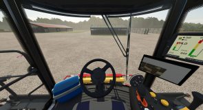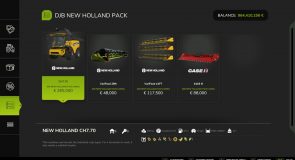 Configurable in the shop: New Holland logos, warning LEDs, additional LEDs on the sides, anti Claas – John Deere- Case decals, DjB decals (give price discount), advertising on the roof (Häckterjäger, DjB [price discount] Forbidden mod [price discount]) or New Holland, tires, straw chopping width [between 9.15m and 12m], warning signs, pipe length [small, medium; large], passenger, rotating beacon, tiger decal, door sticker, cool box, warning LEDs on the warning sign & size of the grain tank