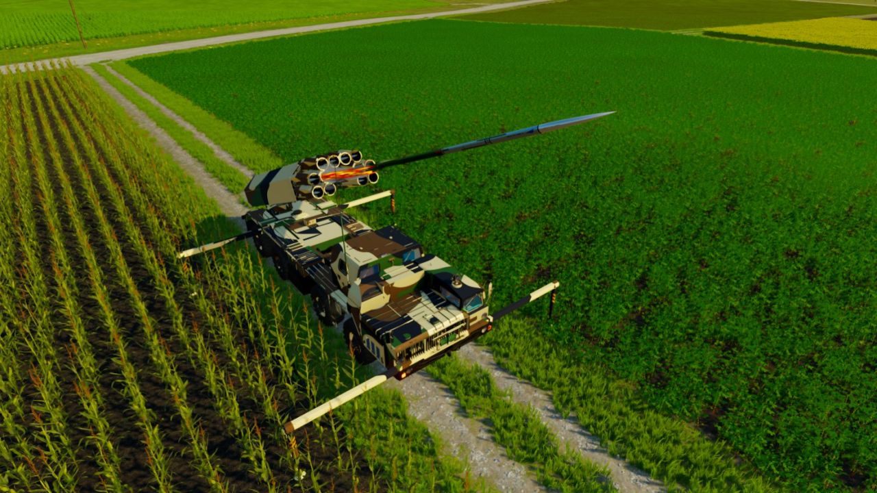 Multiple rocket launcher mounted on a truck. These rocket launching systems are used by military to display multiple rockets in a short period of time, providing a mass fire power over an extensive area. The truck has a camouflage paint scheme and is equipped with stabilizers to ensure its precision during launch.