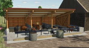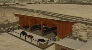 This pack consists of two small, open buildings. One of them includes a cattle barn for livestock, and the other a shelter for equipment, pallets, etc., as well as a bulk bunker for storing manure or similar materials.