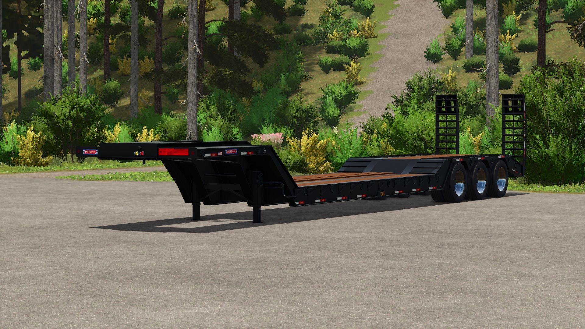 The Pitts LB51-CS Lowboy is a heavy-duty trailer manufactured by Pitts, designed for transporting construction and agricultural equipment. With a weight of 13,500 lbs and dual-axle spring suspension, this trailer provides reliable hauling capability. Its strong frame and low deck height make it ideal for loading and hauling tall or heavy machines. The lowboy design allows for easy loading and unloading, making it perfect for operations requiring safe and efficient equipment transport.