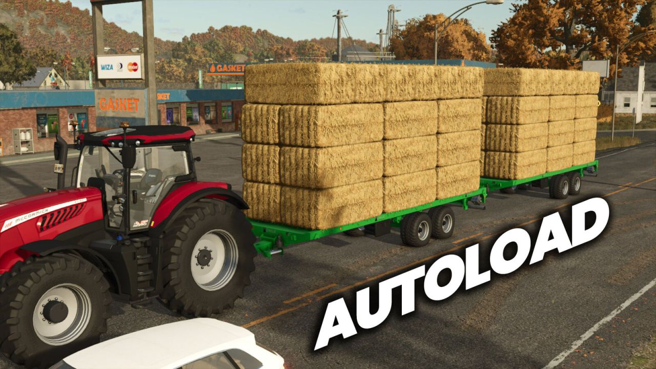 The SPX 816 is a flatbed trailer with autoload functionality for bale transport.