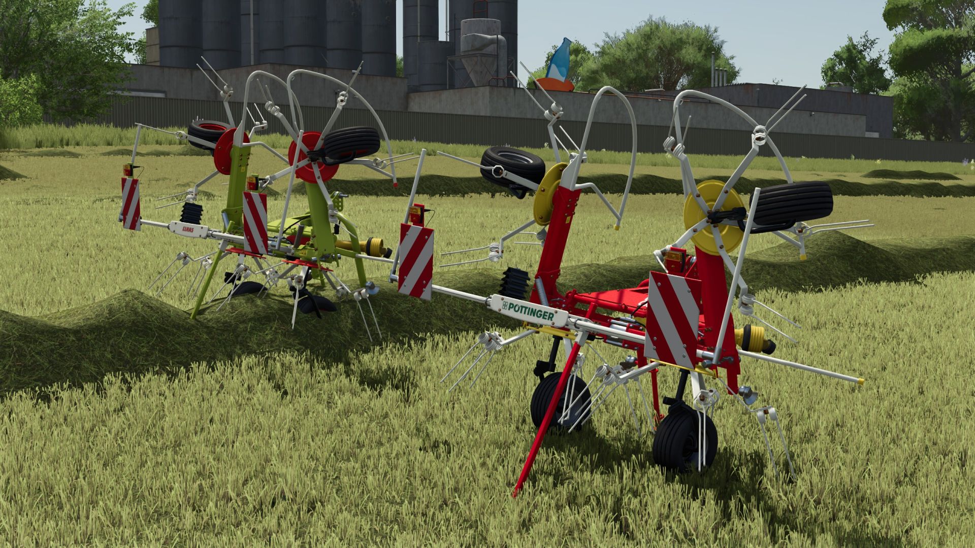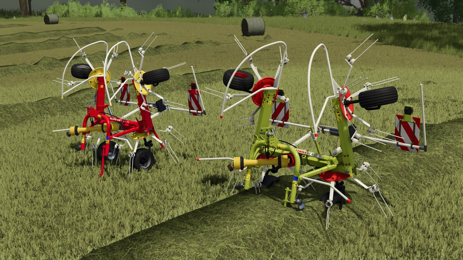 A small Pöttinger AlpinHit44 windrower with ground adaptation and a Claas W450 LS version added thanks to SunnyStar for the decals and the idea of configuring everything.