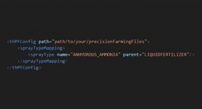 The <sprayTypeMapping> section is like I mentioned above. In this example, I have added ANHYDROUS_AMMONIA using LIQUIDFERTILIZER as a template. Parent must be specified to tell PF how to handle the custom spray. Otherwise, PF would not know if it is a herbicide, manure, solid fertilizer, etc. That’s just how it is set up. The spray types are hard coded, so I made some work arounds for that.