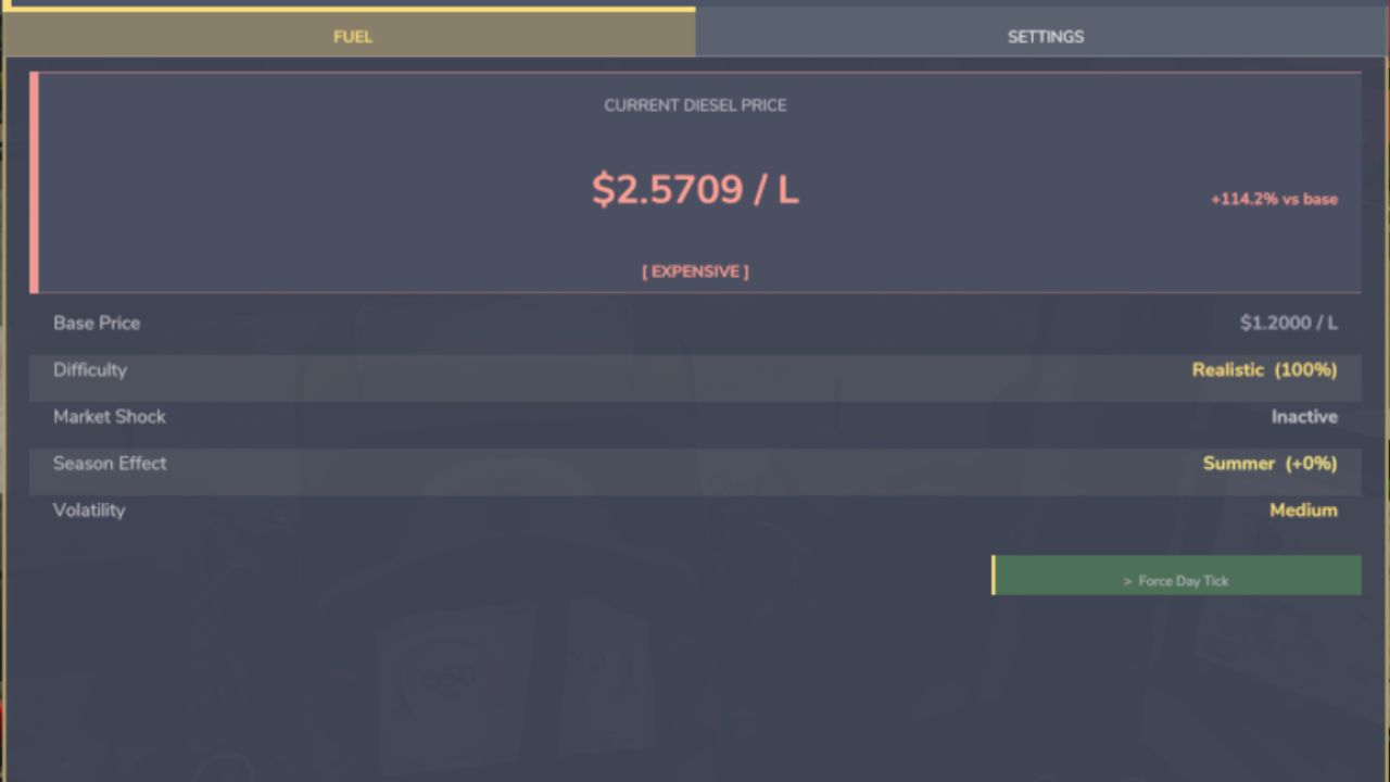 Fill up at any fuel station and pay the market rate. The price isn’t fixed — it moves every game day based on seasonal demand, market forces, and occasional supply shocks. Plan your big harvest runs around cheap fuel days. Watch the price spike in autumn when everyone’s combining.