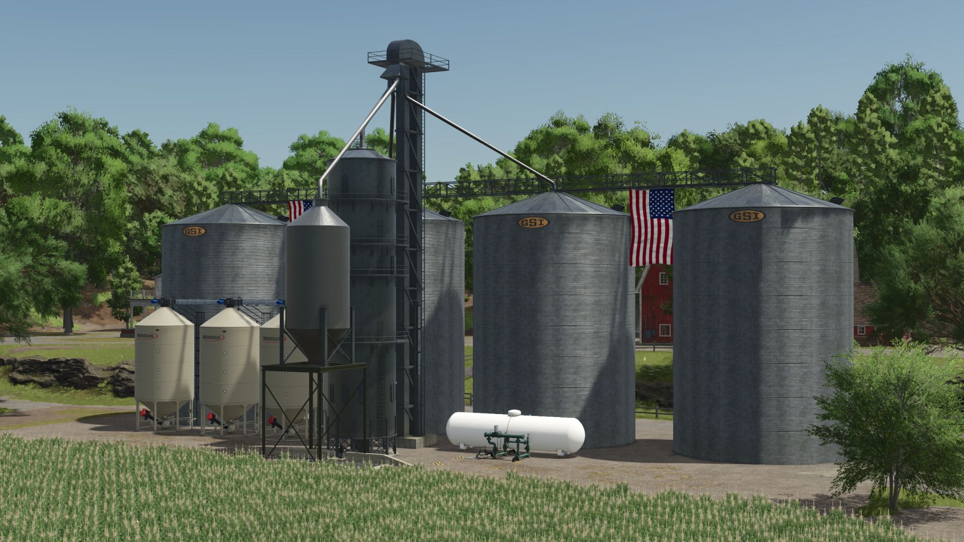 This started life as one of the sell points on the US base map. It is now a corn dryer and storage location that you can fill then set to distribute for your crops to sell or use in other productions.