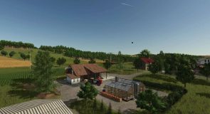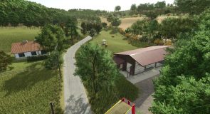For those starting with the “Start from scratch” preset, there is the option to “buy” the entire area outside the 98 fields for €0. I have placed the corresponding field “100” in the wooded area between the cowshed and the limestone crusher.