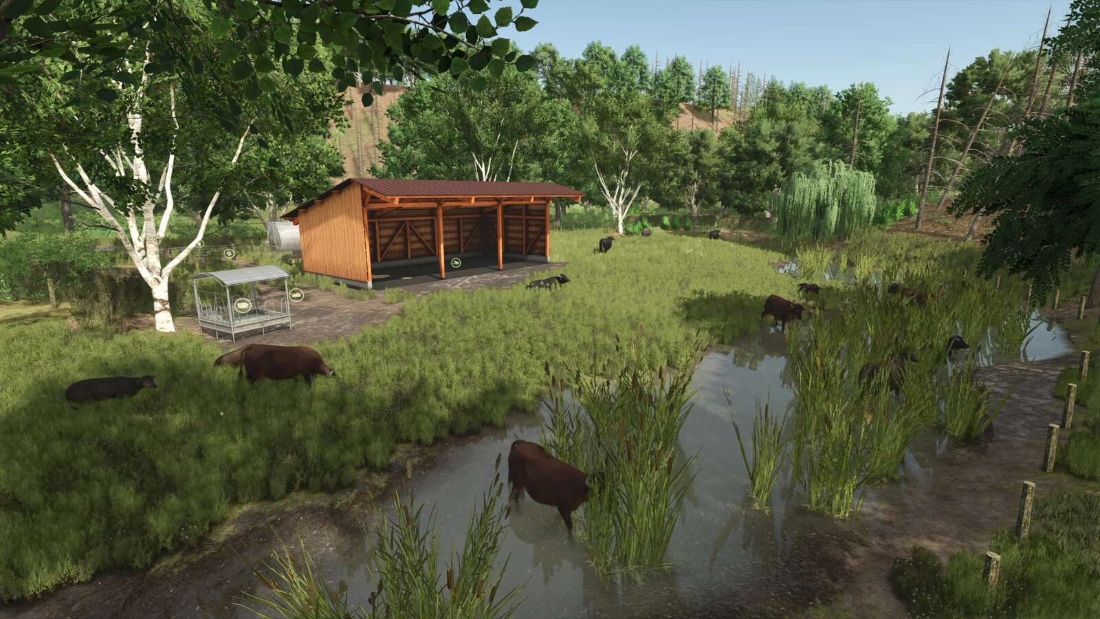 – Several pastures for cows, horses, sheep, and Highland cattle + water buffalo pasture