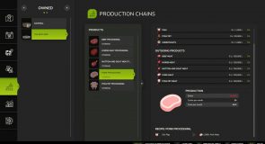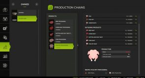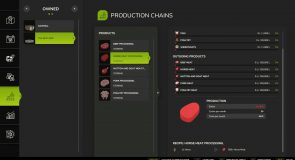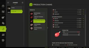 The butcher produces meat pallets from cows (buffalo not recommended), pigs, horse, chickens, and sheep/goats. Animal quantities are calculated at approximately 1 ton per pallet, with slaughter age based on gestation periods.