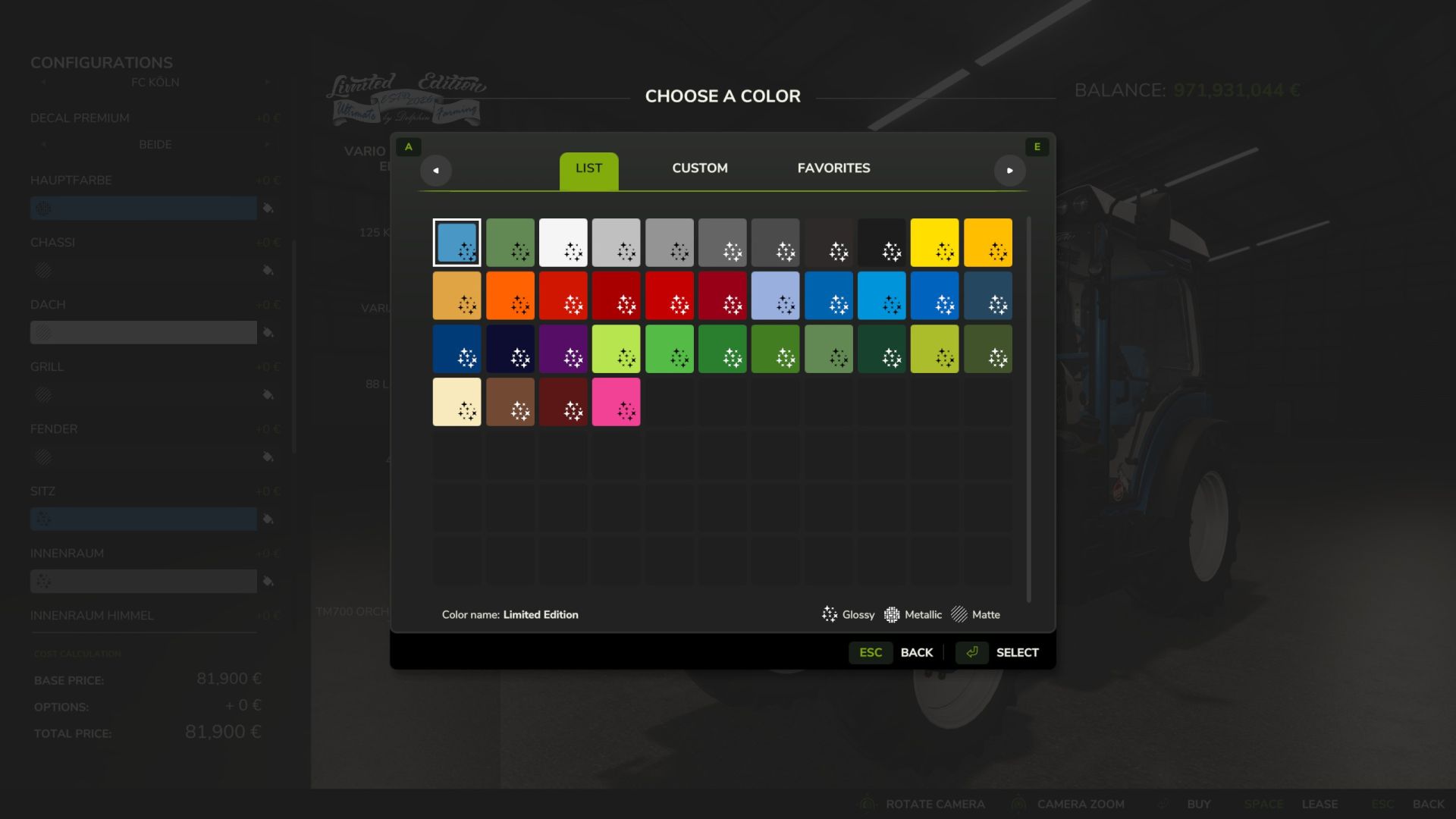 color choices for main color, chassis, roof, grille, fenders, seat, interior, headliner,steering wheel, seatbelt, armrest, armrest buttons, lettering, and wheel color;