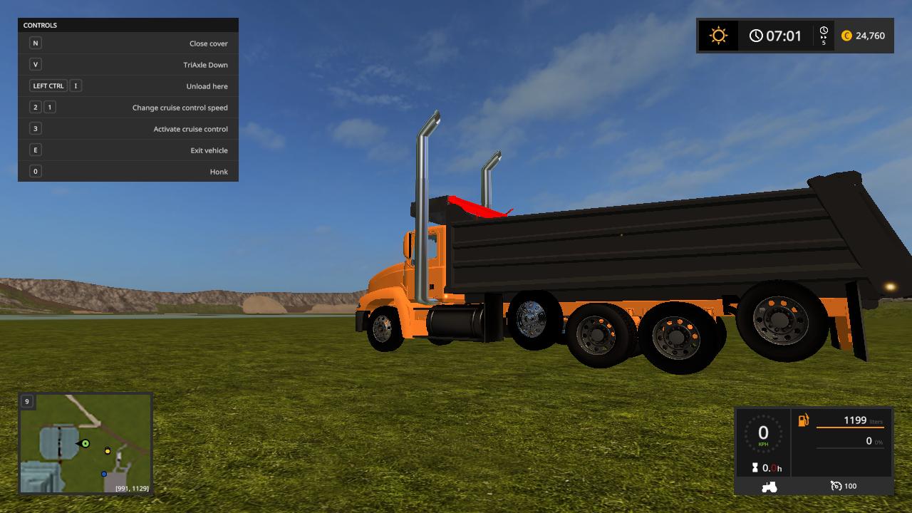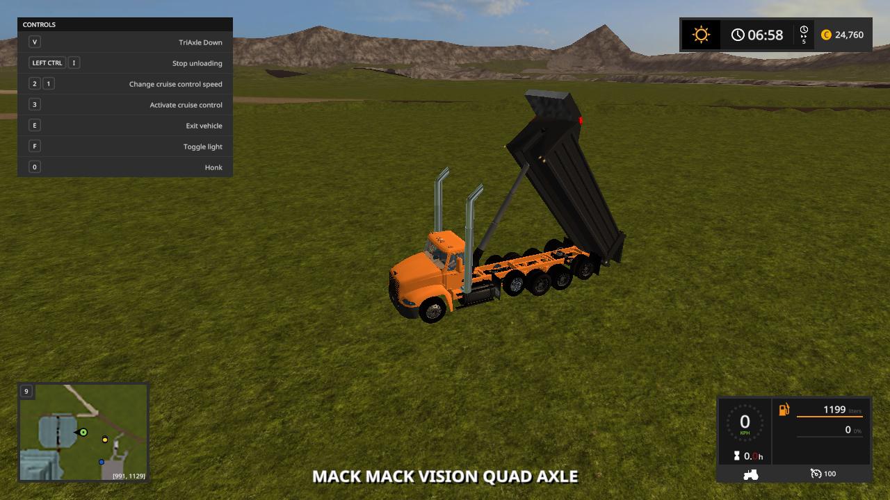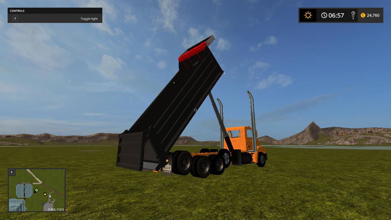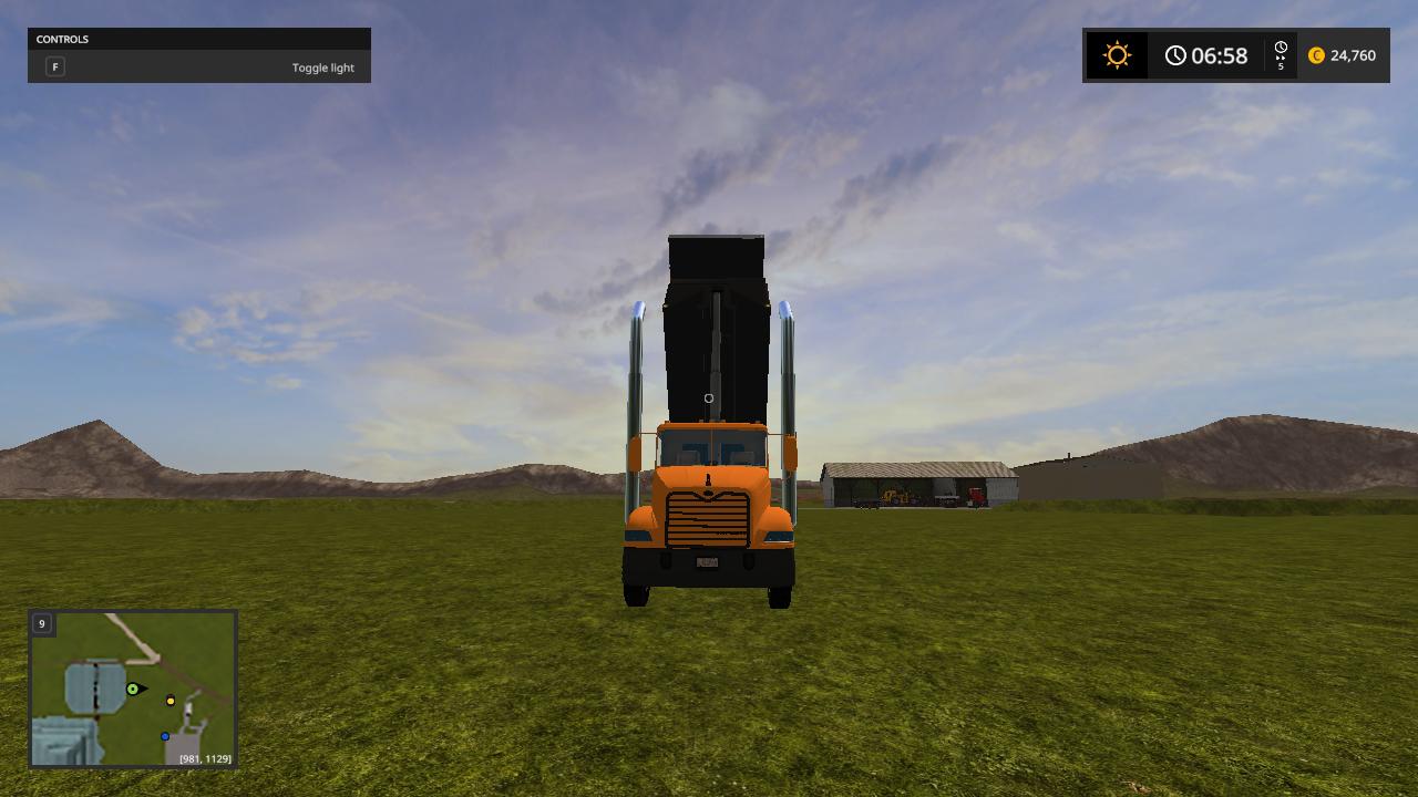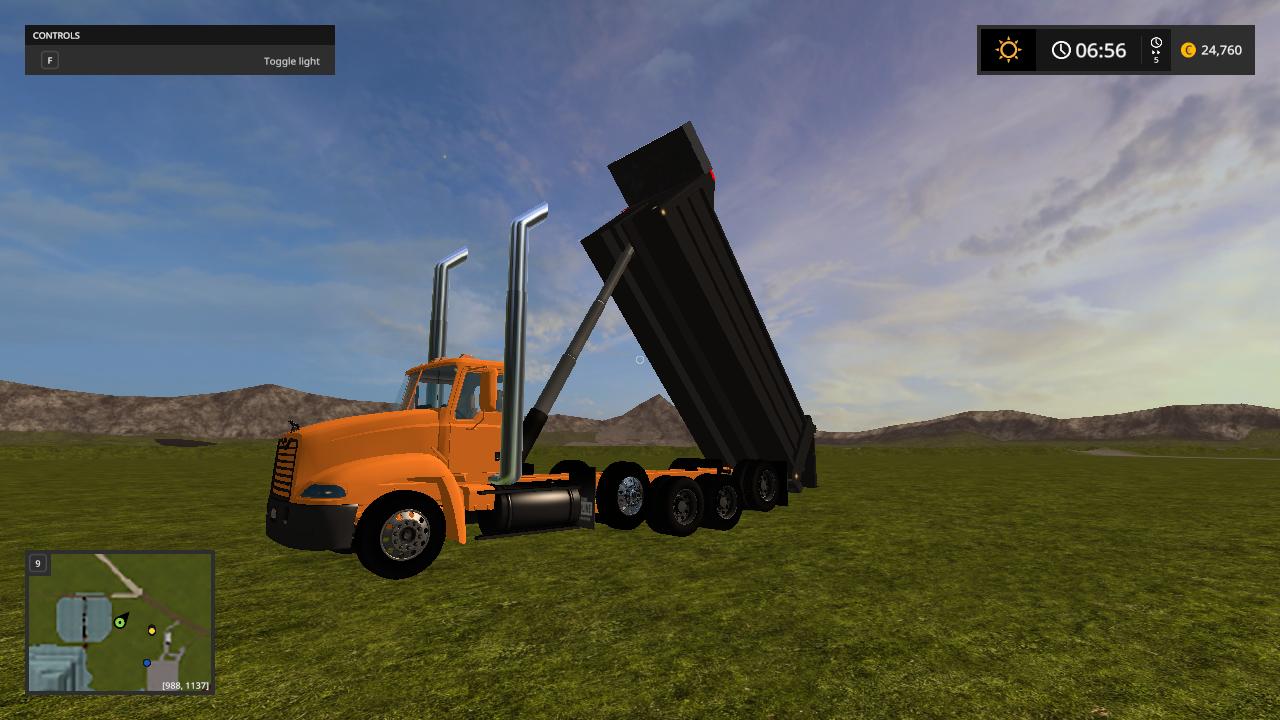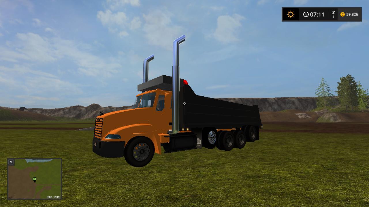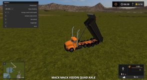 Hello here i present to you my mack vision dump truck the truck is based off the mack vision grain truck from fs15 and was converted over by me while back and  i changed the bed to a dump bed and fixed the cylinders to make it dump like a dump truck instead of grain truck  i redone the xml to make it  support the dump  bed so it can hold the fill planes  i fixed the fill planes to fit the bed and i added a cab protecter  to the bed to make it look like a real life dump truck and made the whole truck color selable  and i added roal coal to the exzaust and added new exzaust pipes in and i also added a spread gate to help spead  your load    i put over alot of time into this truck and i hope you enjoy this truck all credits goes to the original creater and me for the bed and xml work.