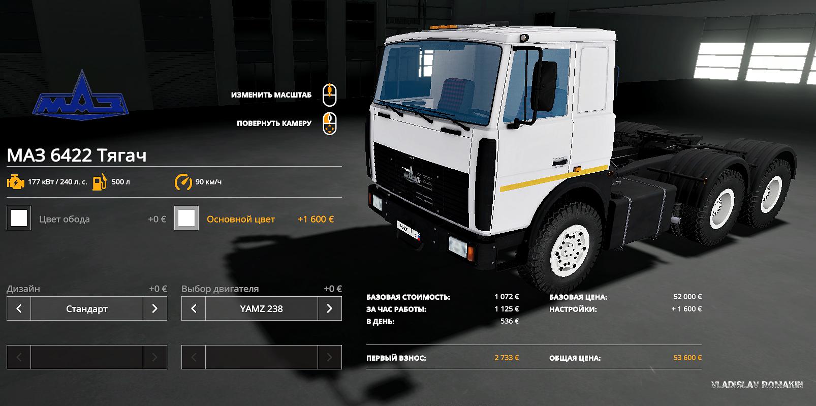 – Power: YaMZ-238 (177 kW/240 HP) and YaMZ 53602-10 (243 kW/330 HP); – Speed: 90 km / h; – Fuel tank capacity: 500 l.; – Price: 52 000 €; – Service cost per day: 520 €; – Choose the color of the cab and wheels; – Different sounds for each engine; – Choice of visor, and various plates; – Working instrument panel; – Working lighting equipment; – Dynamic hoses; – Gets dirty and washes; – Leave no trace.