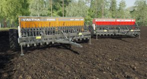 Seeder facing rice fields. It has a pantographic system that improves planting in uneven areas. Both versions have transport wheels, which facilitates the movement of the making to the field.