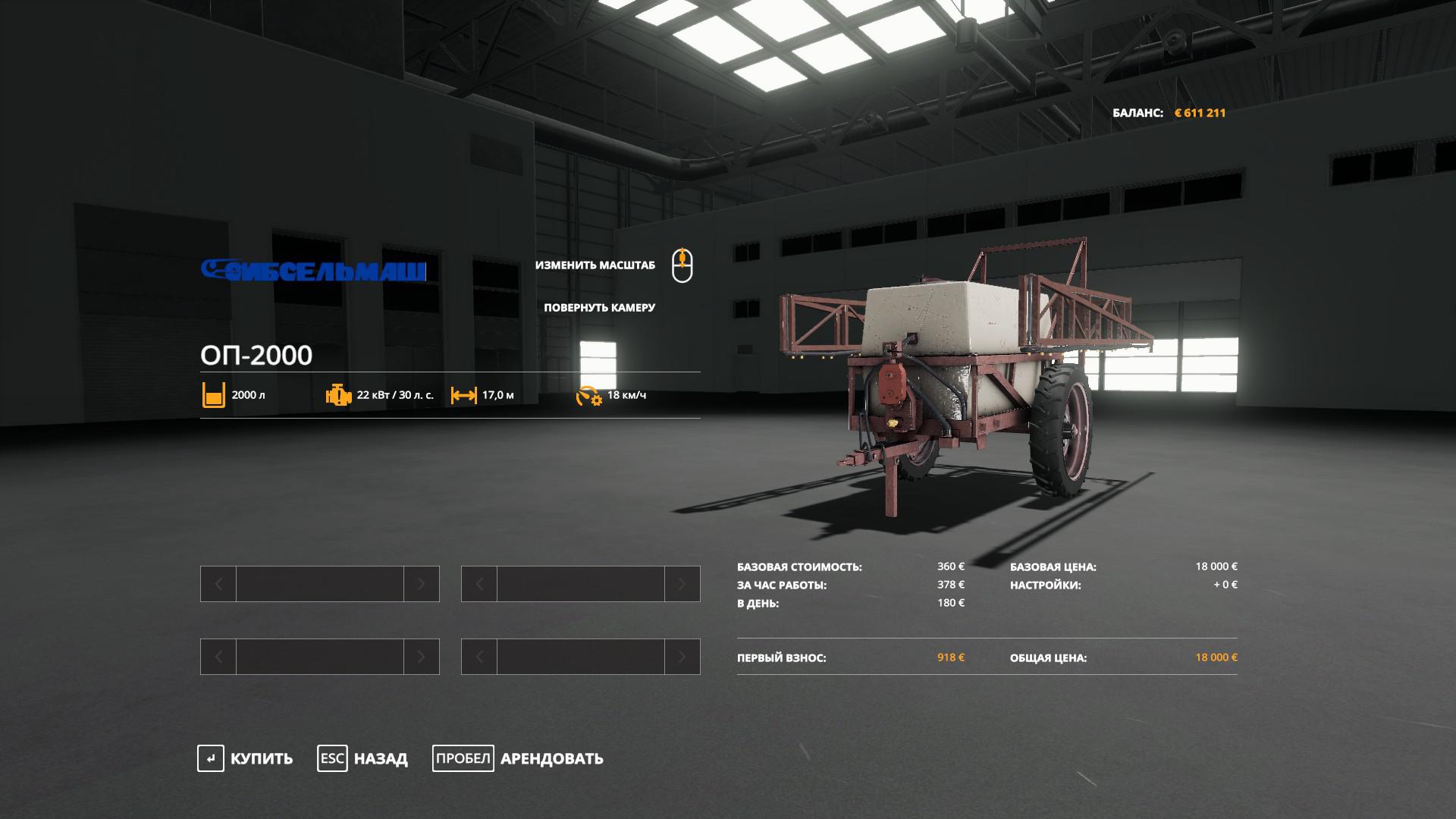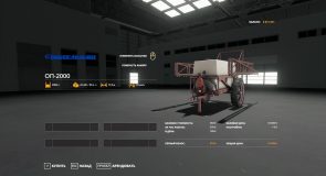 The volume of a sprayer is 2000 liters, working width is 17 meters, the price is 19 000.