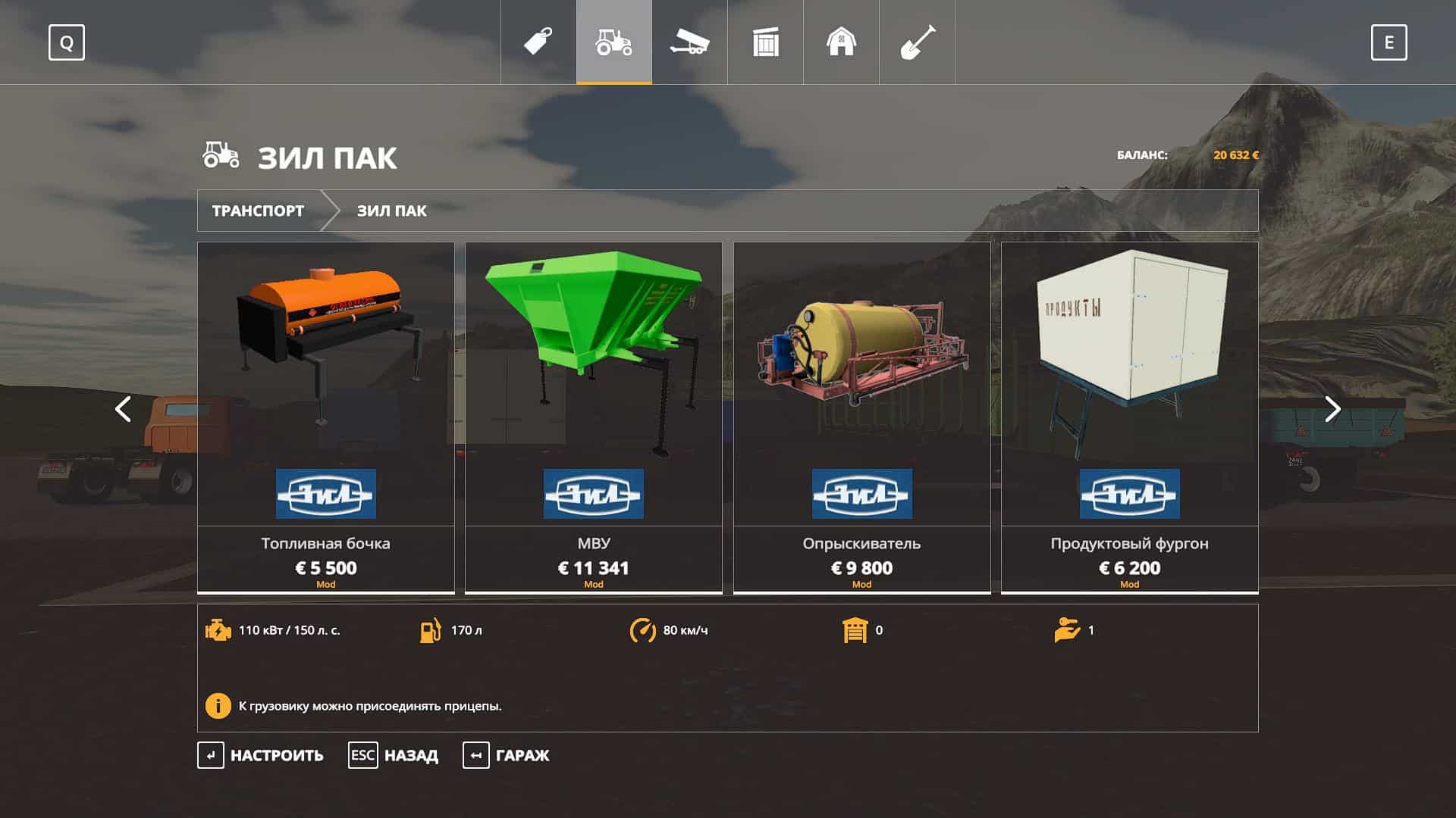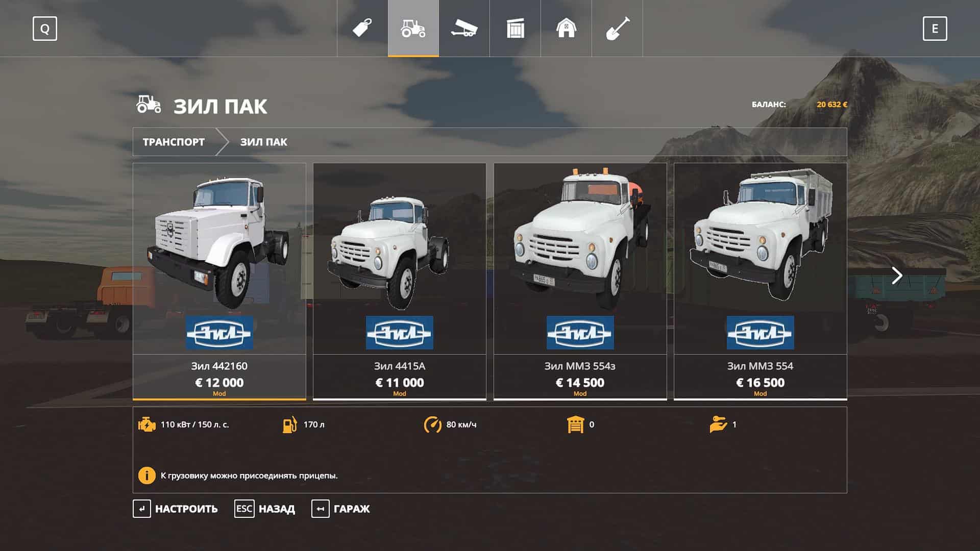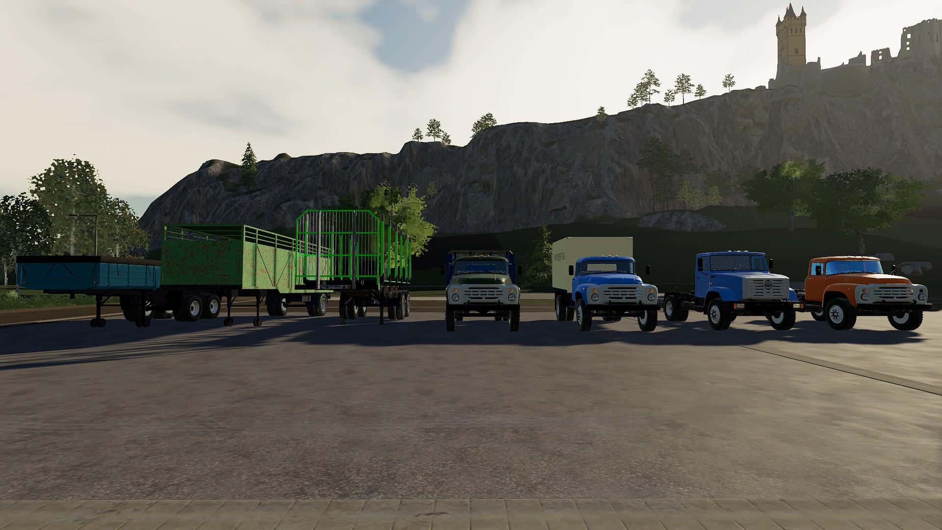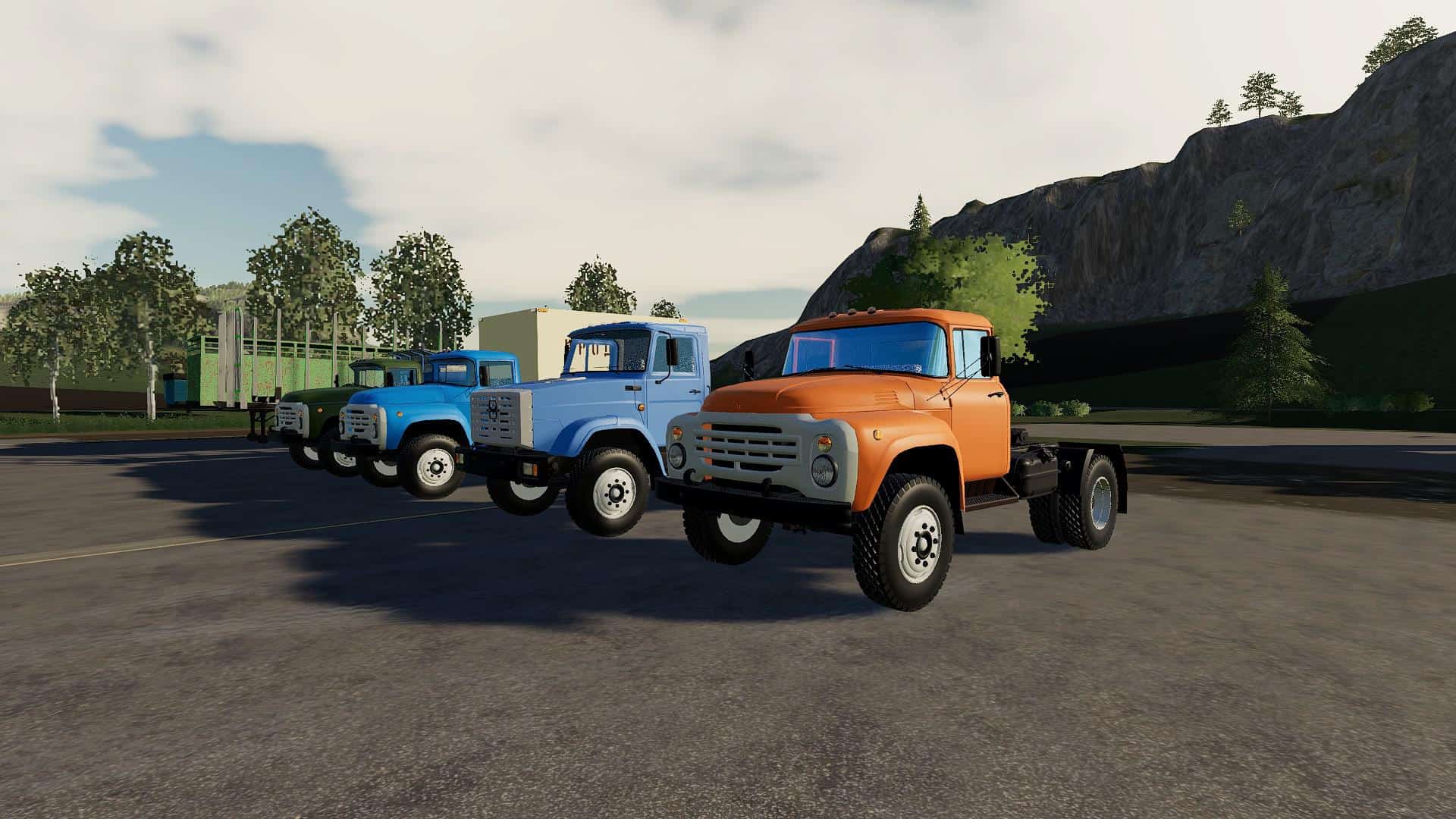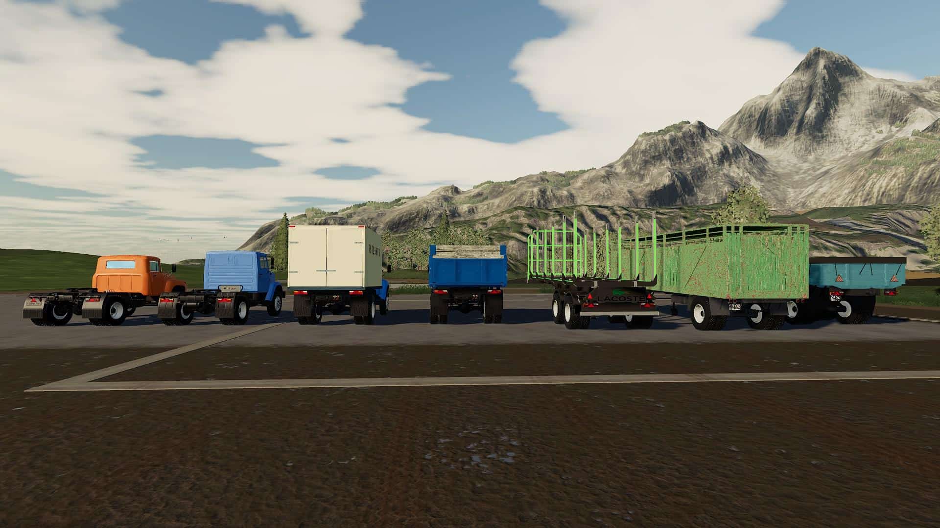 The pack includes: Trucks: – ZIL – 442160; – ZIL – 4415A; – ZIL – MMZ-554 modular; – ZIL – MMZ 554. Trailers and tanks: – State Clinical Hospital – 819; – ODAZ – 885; – ARUP – 8; – ARUP – 8P; – ARUP – 8 universal; – Module – fuel barrel; – timber truck; – cattle truck; – Barrel for milk; – Module – grocery van; – The module – a sprayer; – Module – fertilizer distributor MVU; – KAZ-717.