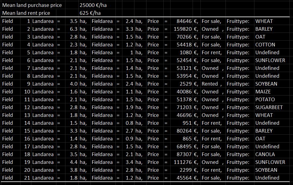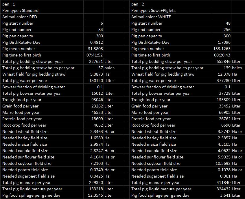The mod writes about 1800 lines of information to the log file. How much land do you own? How many animals can I have with this much farmland? Can I buy more land or should I rent? What crop and how many hectares are needed to feed the animals? How many bales do I need of straw and grass? Do I have surplus crop for selling? What crop gives the highest income per hectare in my area? How much seed is needed? How do I calibrate my spreader / sprayer to spray the right amount? How much milk, wool, egg, manure and slurry do my animals produce? How much nutrient is in my organic fertilizer? How fast will my animal stock reproduce? What if I want to specialize in large-scale animal farming?