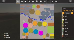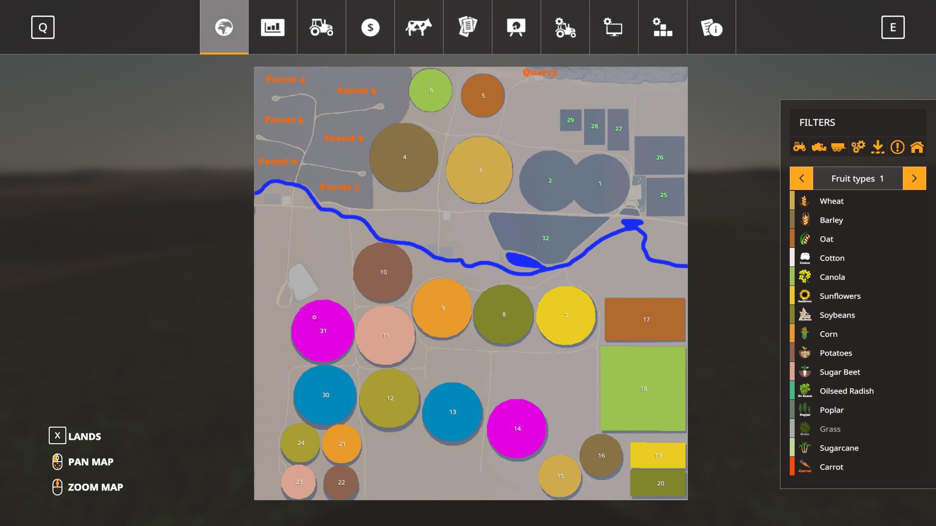 32 fields, 3 sell points, Animal Dealer, 6 forest areas, sawmill, BGA, New Holland Dealer, all the normal animal husbandry, 14 x extra multifruit, 1.2Mil liter potato storage and a huge array of startup fleet… Field sizes are: